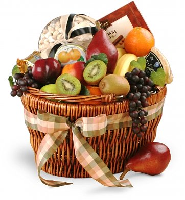 Elegantly finished with cellophane and a bow, the basket holds fruits such as apples, oranges, bananas, and pears along with gourmet items such chocolates, nuts, crackers, and more. A delicious way to send your best wishes.