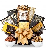 Brilliant black and gold packages deliver a wealth of tasty treats, including Jumbo Toffee Peanuts, Chocolate Confetti Popcorn, Lake Champlain Caramel Chocolate, Spicy Snack Mix, Chocolate Covered Espresso Beans, and more.